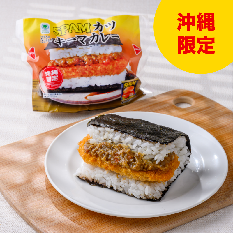 ボリューム感のあるサンドおむすび。パン粉で揚げたスパムカツに玉ねぎ、人参、豚ミンチを使用し野菜の甘味と肉の旨味が溶け込んだカレーソースをトッピングしました。