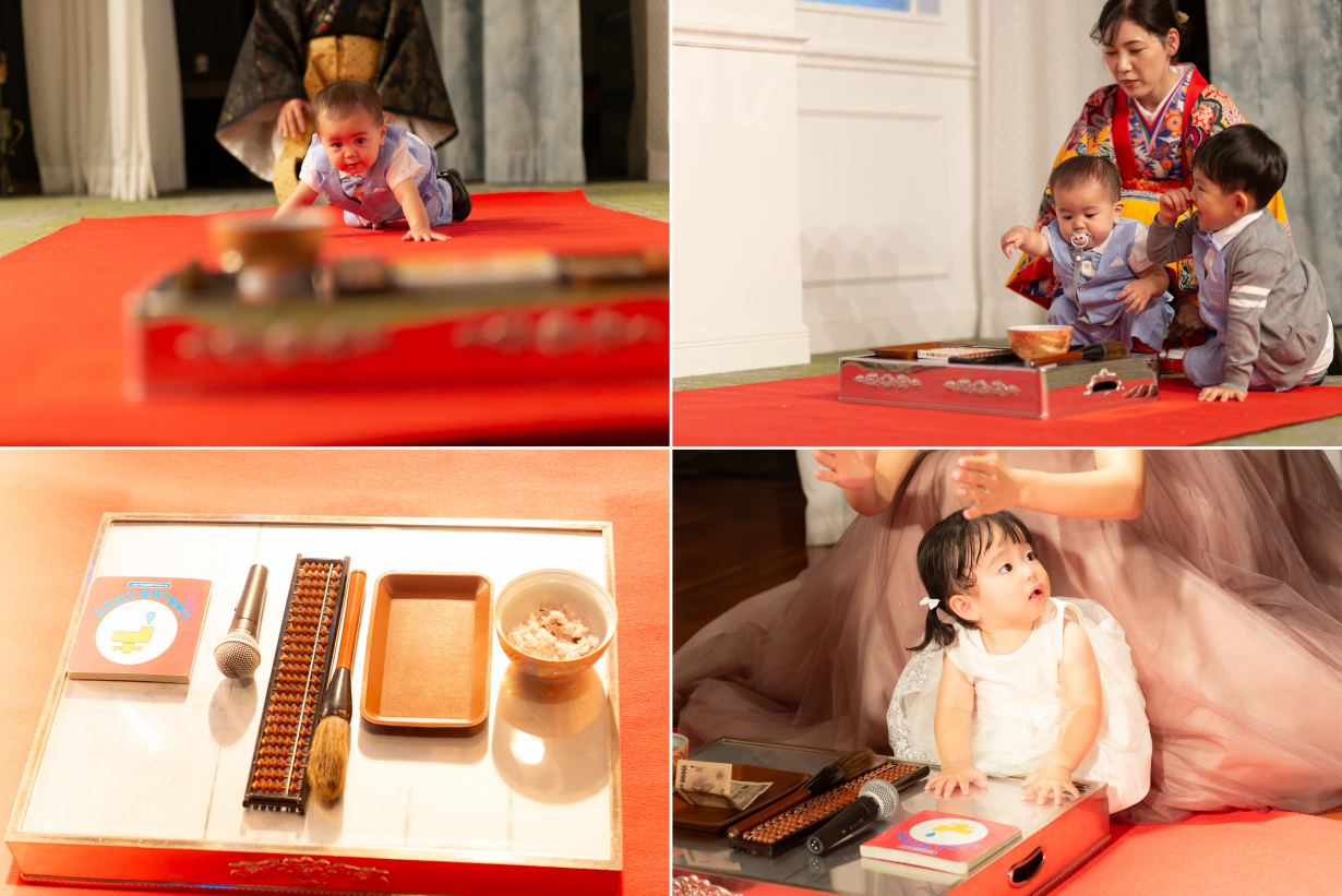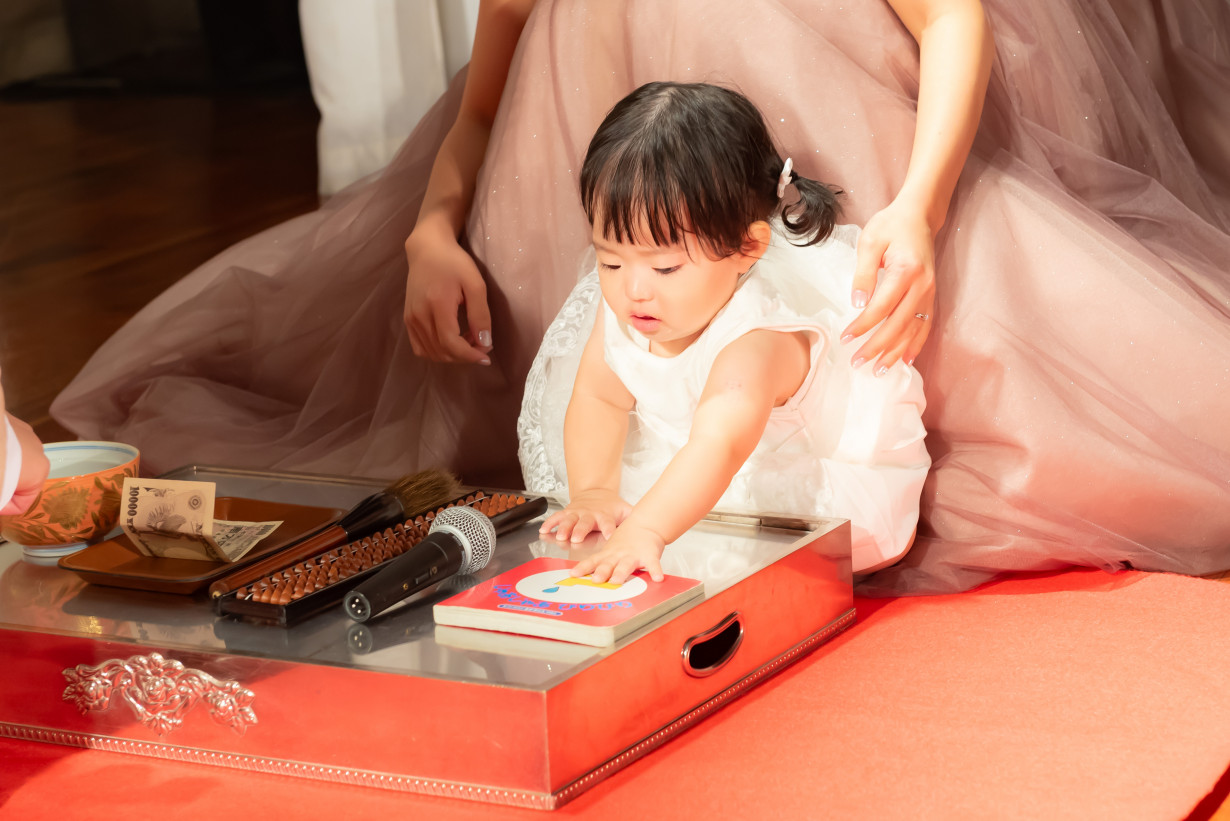 ここまでは一般的なお誕生日祝いと変わりないかもしれませんが、タンカーユーエーでは、墨と筆、本、お金、そろばん、鉛筆…などの品々を子どもの前に並べ、最初に手に取ったもので将来性を占う習わしがあります。