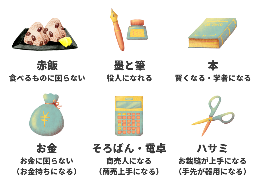近年では、赤飯の代わりにおにぎり・そろばんの代わりに電卓・墨と筆の代わりにペン…など、代用品が用意されたり、楽器やサッカーボールを追加したり…と、時代の移り変わりに合わせたアイテムで占うこともあるのだとか。