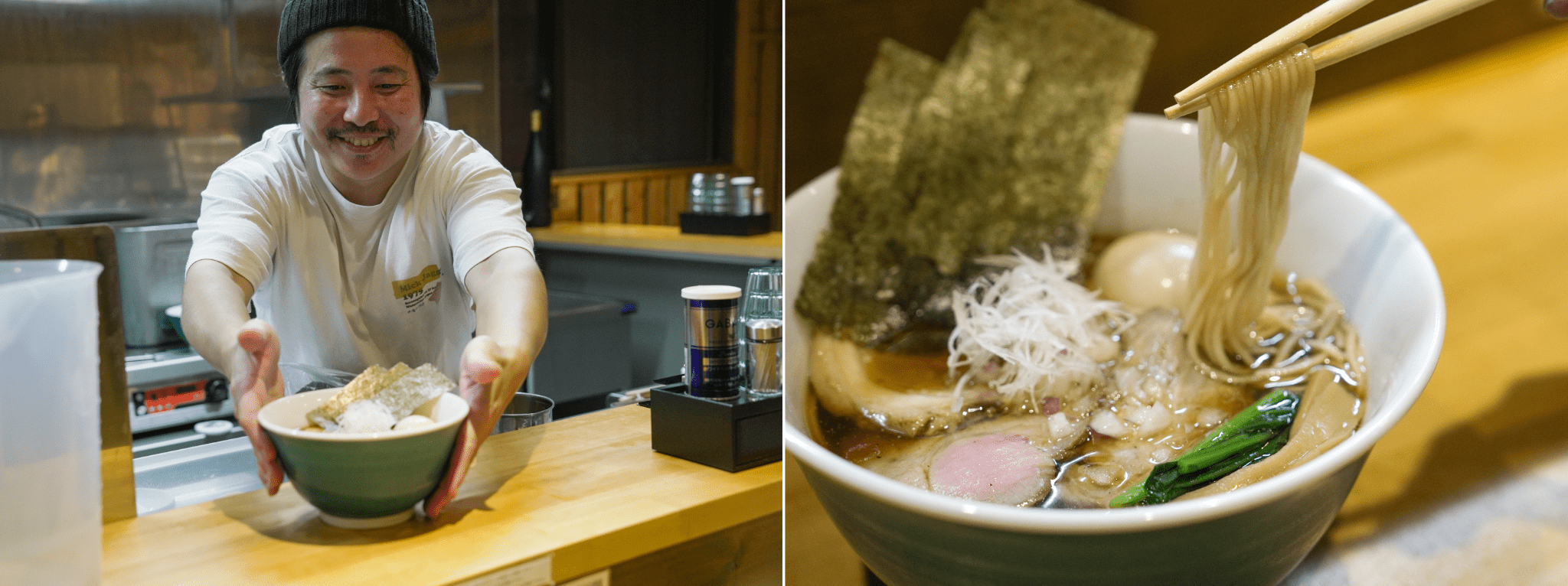 まずは、雑味が出ないように鶏ガラはしっかりと下処理をしています。また、旨味の相乗効果を狙って、昆布や煮干し、鰹節の配合バランスを意識したレシピにしています。表現したい美味しさは「しっかりと醤油のキレが伝わること」。「何が入っているか分からないけど、なんか美味しい」と感じていただけるように旨味を構成しています。それから「最初の一口から最後の一滴まで、ずっと美味しい」を狙っています。キレのある醤油味の奥にある程よい苦味が、舌をリセットしてくれるんですね。だから次の一口も美味しい、最後まで美味しい設計になっています。