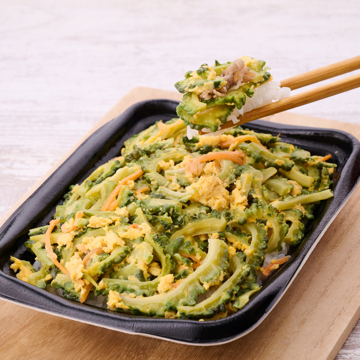 また「増量ゴーヤーチャンプルー弁当」もおすすめです。お値段そのまま、期間限定でゴーヤーを増量。だしの旨味を染み込ませながら炒めたゴーヤーと玉子、豚肉を組合わせた人気メニューです。
