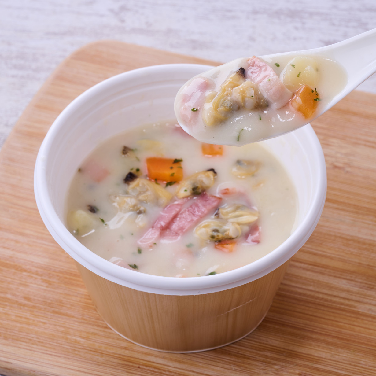 また「たっぷりあさりの濃厚クラムチャウダー」もおすすめです。具材にあさり、じゃがいも、ベーコン、人参が入った旨味を感じるスープです。