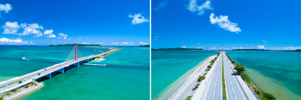 一般的な橋とは異なり、埋立てによって造られた全長約5kmの道路で、四方に広がる海を眺めながら走ることができます。目線の高さに海が広がっているので、まるで海の上を駆け抜けているような気分になれるんです!さらに、遠浅の地形だからこそ見られる、コバルトブルーからエメラルドグリーンへと変化する海のグラデーションも大きな魅力です。そうした点も、うるま市の海中道路ならではの特徴ですね!