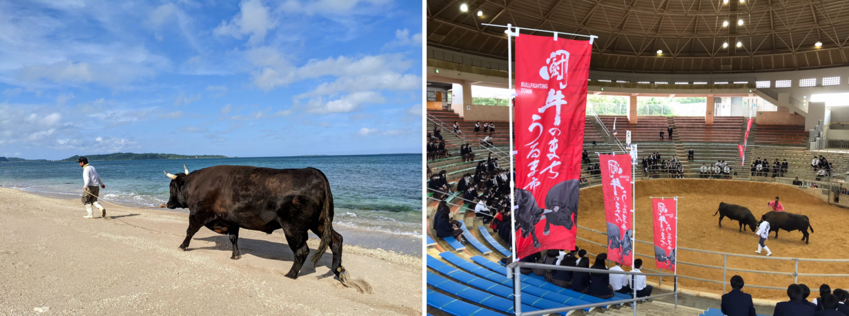 うるま市をドライブしていると、牛の散歩を目にする機会もあると思うのですが、うるま市、特に石川地区では盛んに闘牛が行われています。2019年には、闘牛文化の未来への継承を目指し、「闘牛のまち宣言」を発表しています。
