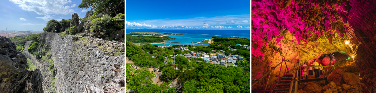 左:安慶名城跡/中央:シヌグ堂バンタからの景色/右:CAVE OKINAWA(鍾乳洞)