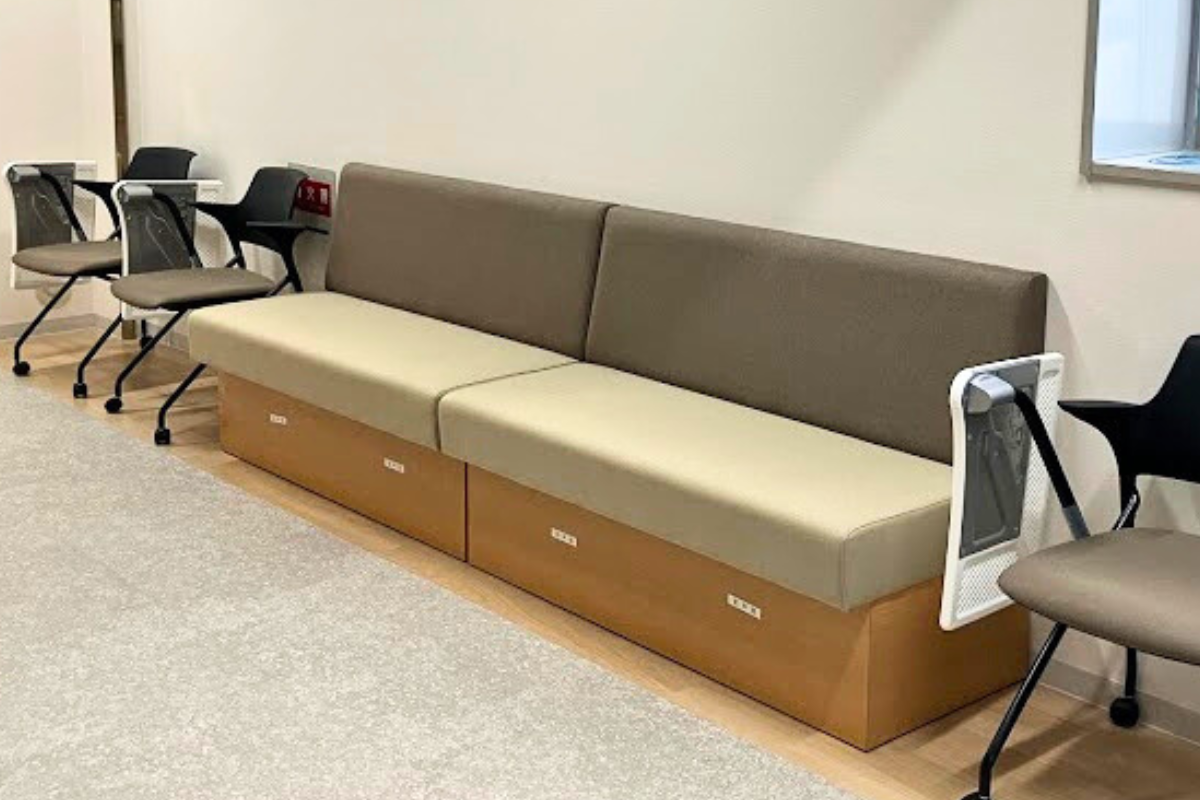 見慣れた自動ドアや、店舗と同じデジタルサイネージが並ぶ空間は、来客者にとっても親しみやすく、自然と緊張がほぐれそう。