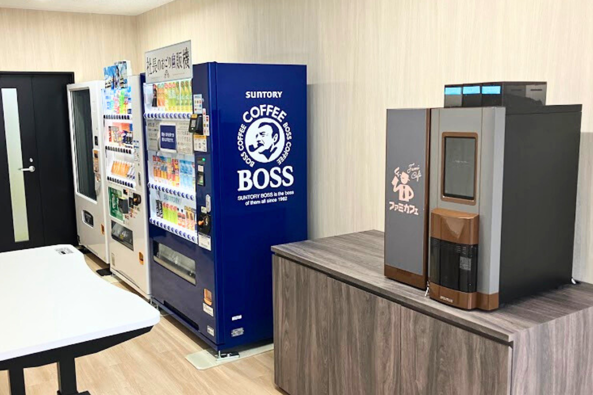 ロビーを抜けてミーティングルームへ向かう途中、ふと現れるのがこの自動販売機エリア。