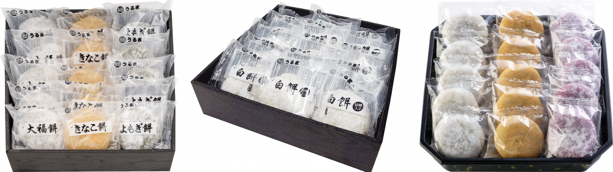 写真左から:もちセット(大)、白もちセット(砂糖入り)、ミニもちセット