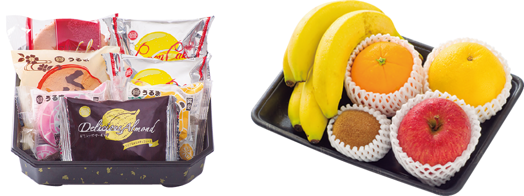 お菓子やフルーツのお供えも、ファミマにお任せ。色鮮やかなお菓子を左右対称に盛り付けると、より丁寧な印象になります。