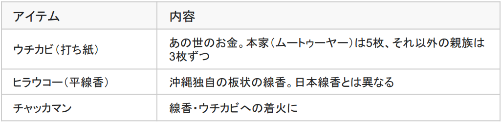 - ①ウチカビ(打ち紙)・ヒラウコー(平線香)・チャッカマン