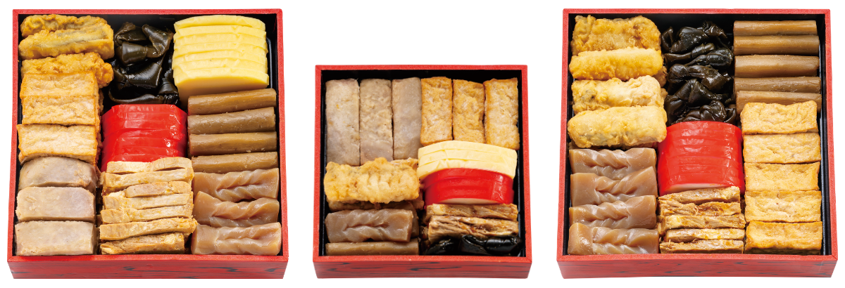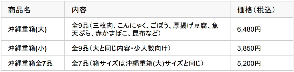 沖縄ファミマでは、沖縄重箱(大)全9品沖縄重箱(小)全9品・沖縄重箱全7品の3種類をご用意。集まる家族の人数に合わせてお選びいただけます。