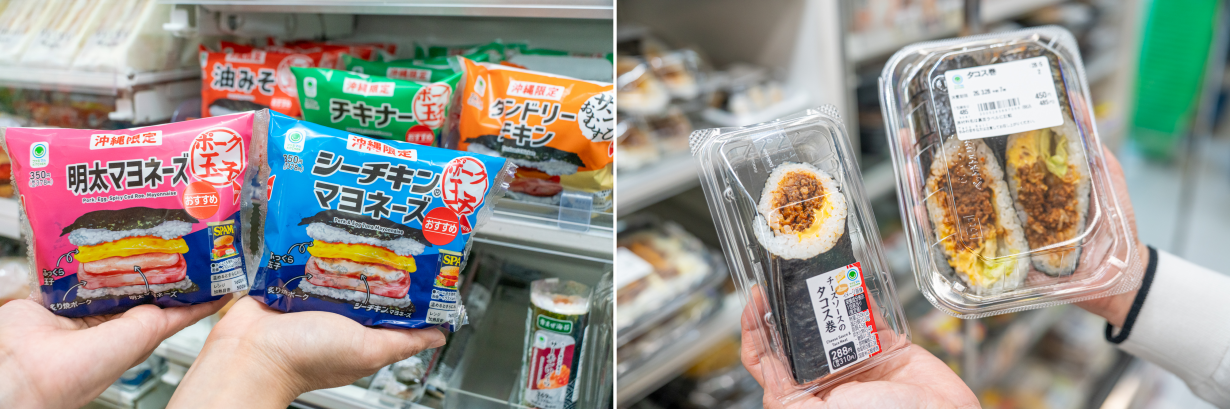 - ①沖縄らしさ満点!ポーク玉子おむすびシリーズ&タコス巻き