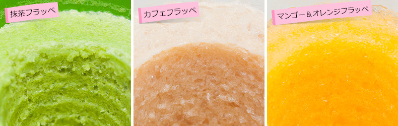 また、3種のフラッペは氷の粒の大きさも微妙に異なっているという事実と、その資料を画像を入手!抹茶、カフェ、マンゴー&オレンジの順に粒が荒いようなんだが、写真でわかるかな~?