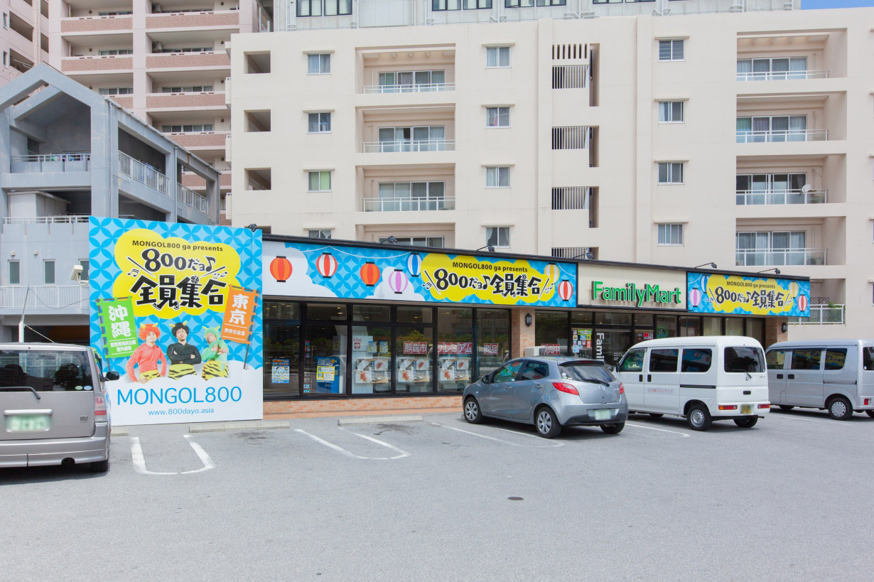 MONGOL800 が再びファミマおもろまち二丁目店をジャック! 「800だョ全員集合!!」コラボ企画“ファミパチマート“として、ラッピング店舗が登場(2015年10月初旬まで予定。台風時など一時外装撤去対応などもあり)