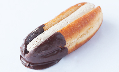 ふんわりでサックリとしたドーナツ生地をV字にスライス。チョコを1/3浸して、口溶けの良いコーヒークリームをたっぷりと絞りました。