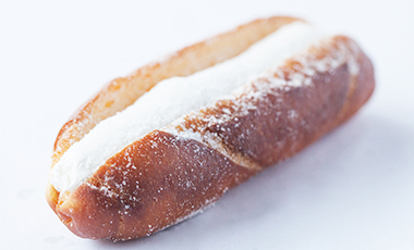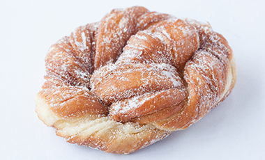 生クリーム入りで風味のよいデニッシュ生地を揚げ、ドーナツシュガーを全体的にまとわせたひと品。サックリとした食感が楽しめます。