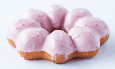 ドーナツ専用のフライオイルで揚げた生地を、イチゴのつぶ入りチョコでコーティング。モチモチ食感の生地と甘酸っぱいイチゴチョコの相性が◎。