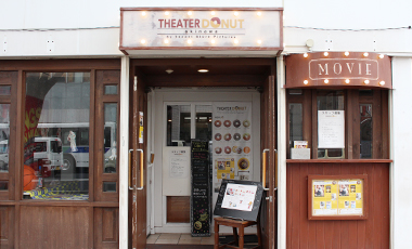 2階の店舗まで細い階段を昇りながら、期待感が高まる。ドーナツ好き&映画好きにはたまらない空間がここにはある。まずはエントランス部分のカフェスペース。こちらでは飲食のみもOKなので、オリジナルのドーナツを味わいながら読書やおしゃべりを楽しむ人の姿も見られる。そして奥のスペースがカフェシアターとなっていて、1日5回映画を上映。おいしいドーナツ片手に映画を鑑賞したい。おすすめのBセットは、お好きなドーナツ2個とソフトドリンクのセットで630円(税別)。