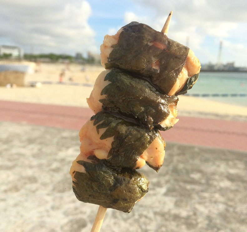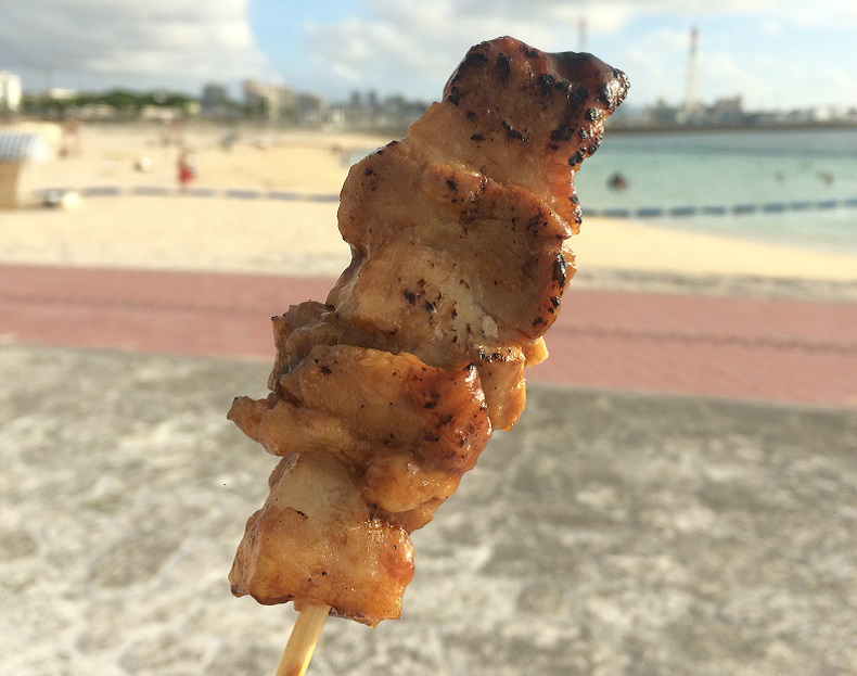 率先して、筆者がビーチで飲んで食べてみることにしました。もも・かわ・ねぎま、定番人気3種が最近とっても美味しくリニューアルしたようなので、気持ちも高ぶります。タレと塩がありますが今回はタレ味をチョイス。