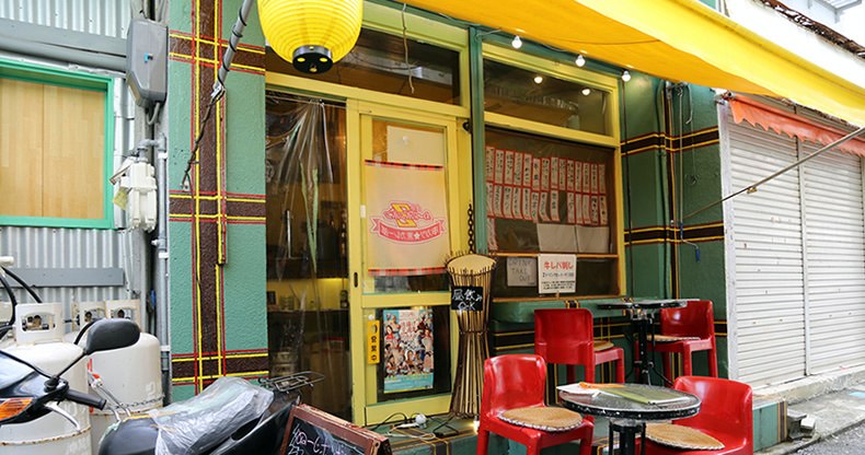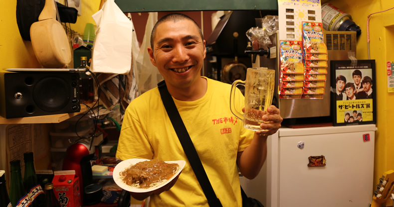 2.5坪の店内は大人5人が入ると満席状態になる狭さ。初対面でも自然と会話が弾みそうな絶妙な距離感がいいですね。ムームー屋のにーにー、野菜売りのおばぁ、市場周辺で働く人にもファンが多いのでローカル気分も味わえます。店主伊藤直記さんの茶目っ気具合も素敵です!