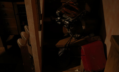 建物の中はひっそりと静まり返り、真っ暗な闇が広がっていました。徐々に目が慣れてくるとぼんやり見えるのは放り出されたランドセル、今にも鳴りだしそうな黒電話。屋敷は10年前のあの事件のまま時が止まっているかのようです。