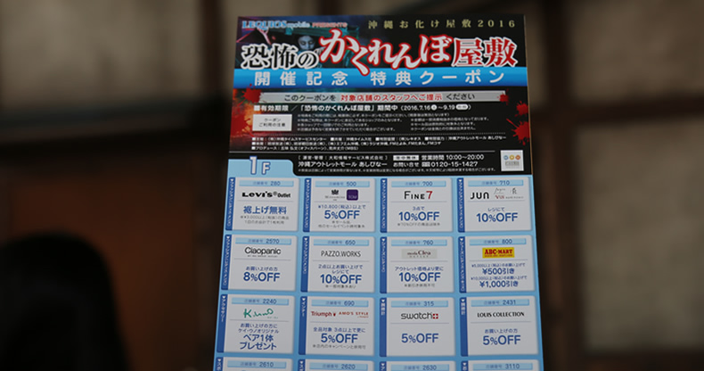 出口までたどり着いた暁には、あしびなーの各ショップで使える特典クーポンがもらえます。お化け屋敷開催期間中は何度も利用してOK。ひんやり肝を冷やした後はショッピングで笑顔を取り戻してくださいね。