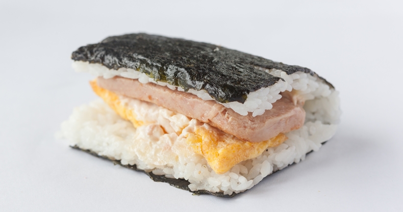 白ご飯におかず(スパムと玉子焼き)が挟まれているポーク玉子おむすびは、一食で完結できるボリューム満点フード。部活帰りの中高生からも大人気だとか。