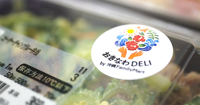 店内のお弁当コーナーには、ゴーヤーチャンプルー弁当やポーク玉子おむすび、チーズ野菜タコライス、タコス巻など、本土のファミリーマートでは見かけない商品が数多く並んでいます。そして、この「おきなわDELI」マークが貼られています。 これは以下いづれかの条件を満たしている商品に表示されるこだわりの証なんです。