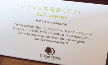 また、CARELINE(ケアライン)といって、お客様に快適に過ごしていただくためのコールボタンを用意しています。どんな些細なことでもこちらの番号に電話していただけましたらいつでもご対応いたします。どちらもダブルツリーの文化ですね。