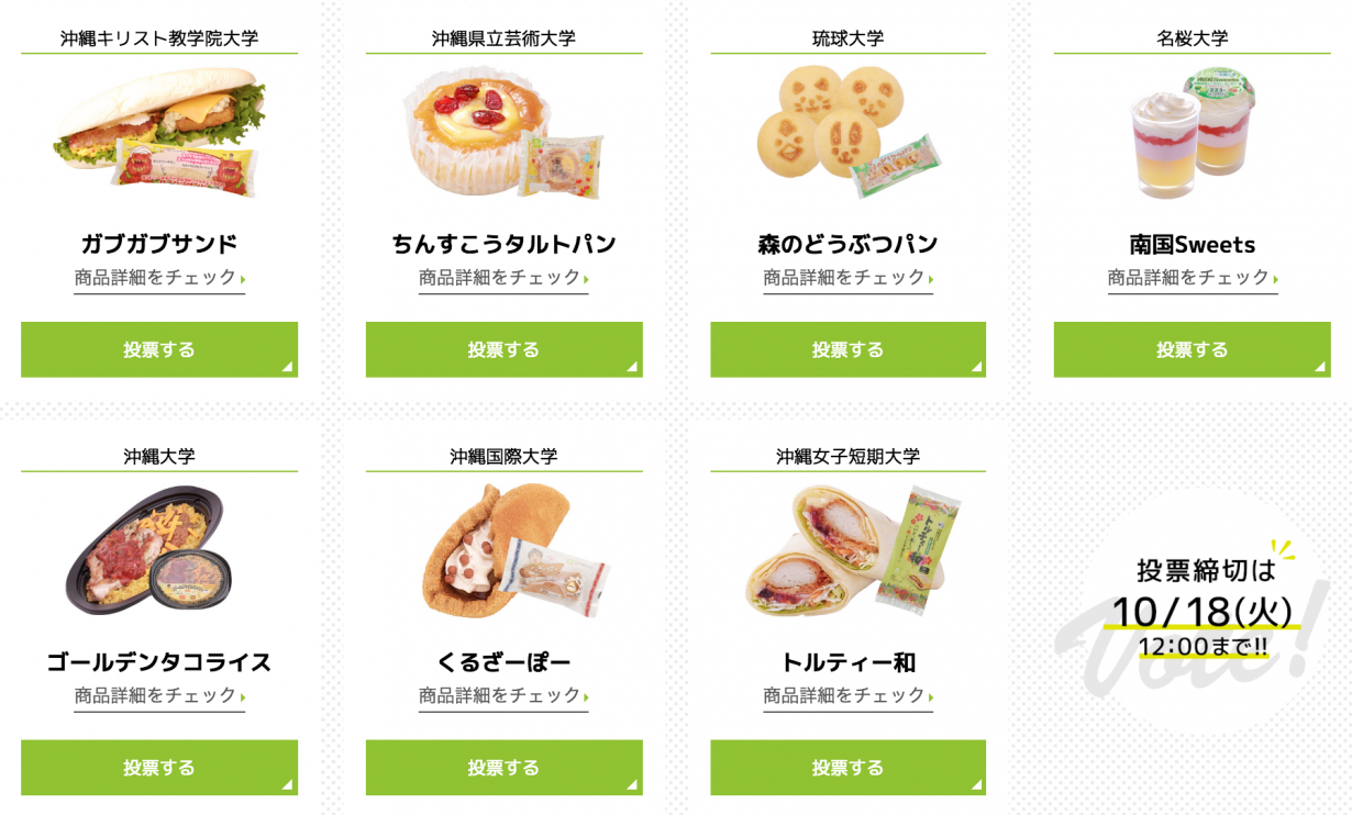 小川さんの母校である沖縄大学をはじめとした、県内7大学の学Pチームによる自慢の商品たち。その人気投票を10/18(火)12:00まで受付中!!お気に入りの商品を応援しよう♪投票はコチラから
