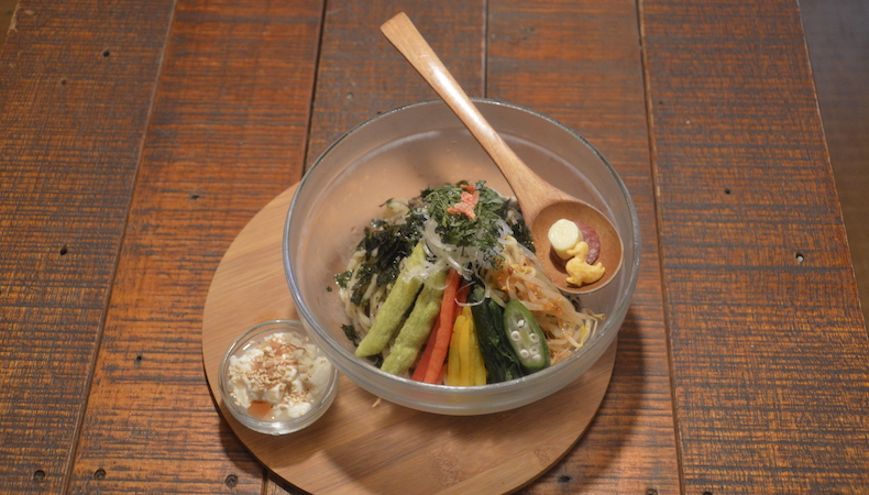 「本来うどんで作られる岩手の盛岡じゃじゃ麺をヒントに、具材も肉味噌・キュウリ・ネギだけなのを、沖縄の食材を多くしてなるべく地産地消に近づけるようにしてみました。沖縄に根付いたものをということで、琉球じゃじゃ麺なんです。」