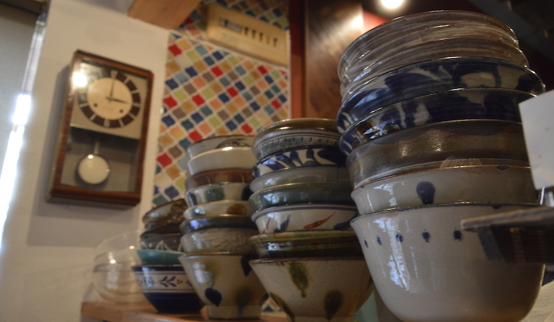 入口から小ざっぱりとした手作り感がおしゃれですが、店内に入っても、小ぢんまりしながらも、スッキリおしゃれです。どことなく文学を感じさせるアートな雰囲気の中、出てくるそばとは??柄の違うそばドンブリが積まれているのを見て、期待が高まります。