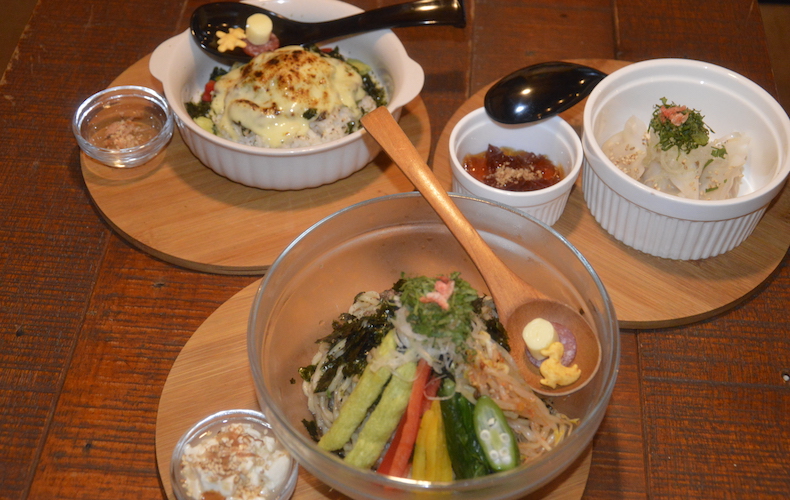モガメンさんで1番人気のメニュー3種。3品同時にオーダーする方も結構いるそうです。彩りいっぱいお腹いっぱいで合計1280円だから、コスパも良いですね。
