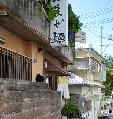 那覇は国際通り、ホテルJALシティの角を曲がって、素敵なお店が並ぶニューパラダイス通りに向かうと、左手に「まぜ麺」の看板が目に入ります。