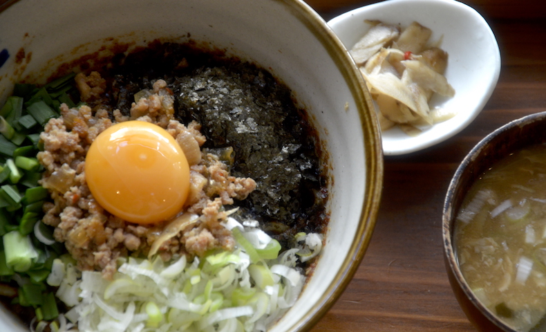 麺が見えないほどのたっぷりのトッピングが美味しそ~ぅ。おかわり自由の味噌汁と付け合せ、それから追いめしも付くから、見た目ですでにコスパ抜群です。これを豪快に混ぜていただくのだそうです。