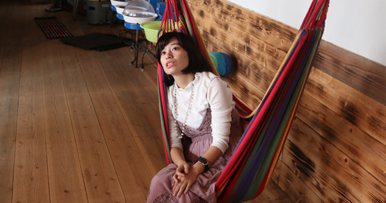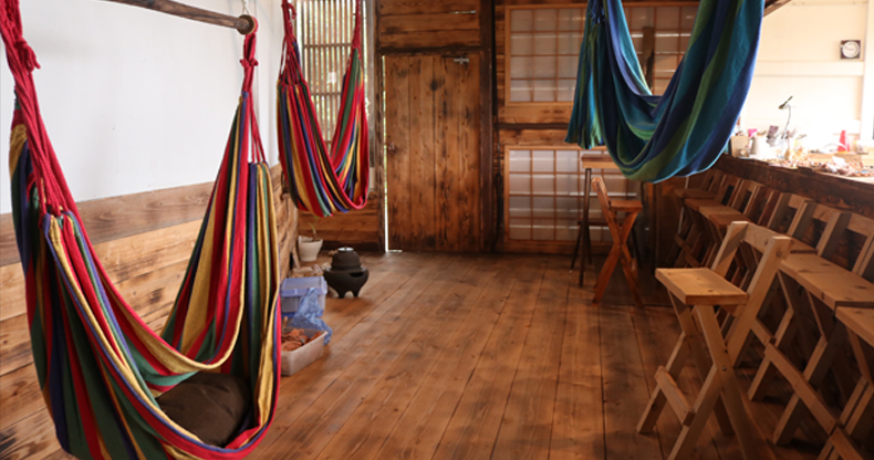 田中:「それにしても素敵な店内ですねー!ハンモックもいっぱーい!右のハンモックは股下120cmくらいある人用かな?」