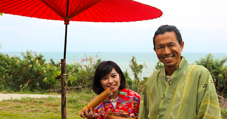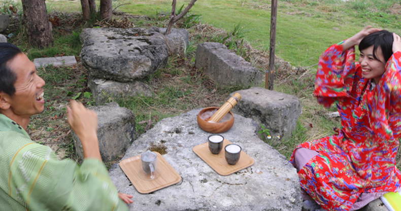 ナチュラ田中:「ぶくぶく茶体験ではお茶受けに南城市のお菓子をご用意してます」