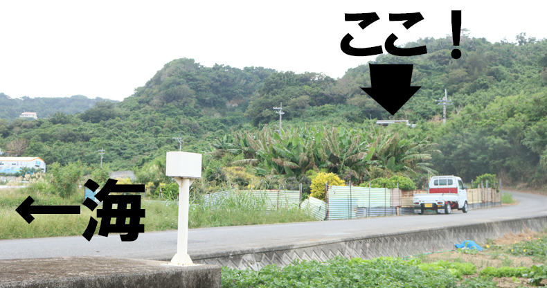 すると下図のような場所に出ますので、海を背にして道なりに進むと右手にあります。