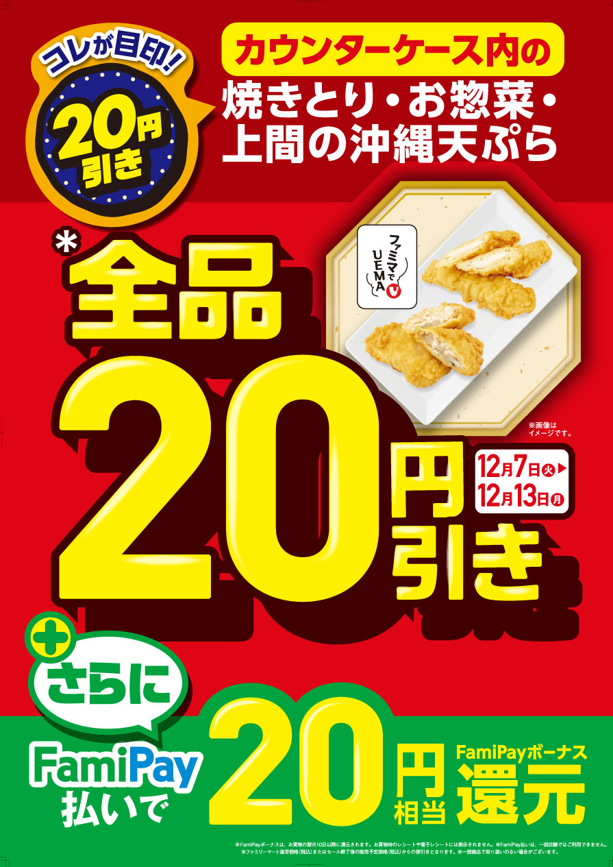上間の沖縄天ぷら含む常温惣菜(焼きとり・お惣菜)全品20円引き+FamiPayボーナス還元!※終了しました。