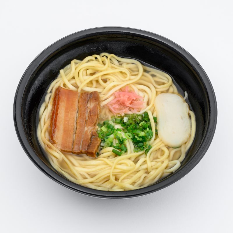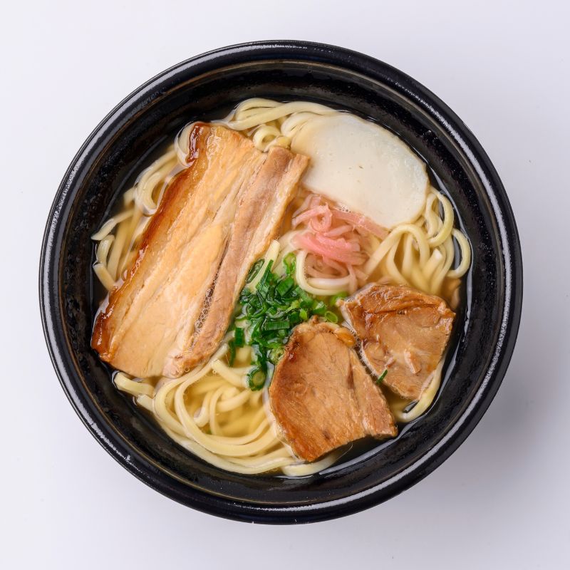 【内容】三枚肉をのせたベーシックな沖縄そば。鰹出汁の旨味と香りが効いたスープにストレート麺の沖縄そばの組み合わせ。三枚肉、ねぎ、かまぼこ、紅生姜をトッピング。別添七味唐辛子付き
