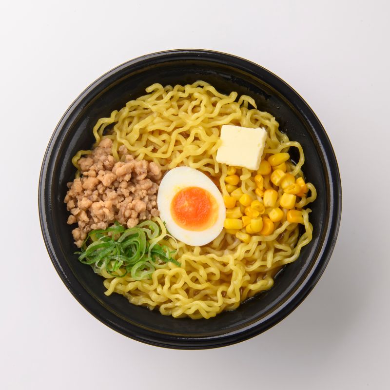 【内容】5種類の北海道仕込みのみそを使用したスープに、県民の嗜好にあうようラードを追加し塩味を調整したスープ。しっかりした食感が特徴の三層麺をちぢれ麺に。茹卵、青ねぎ、肉そぼろ、バター、コーンをトッピング
