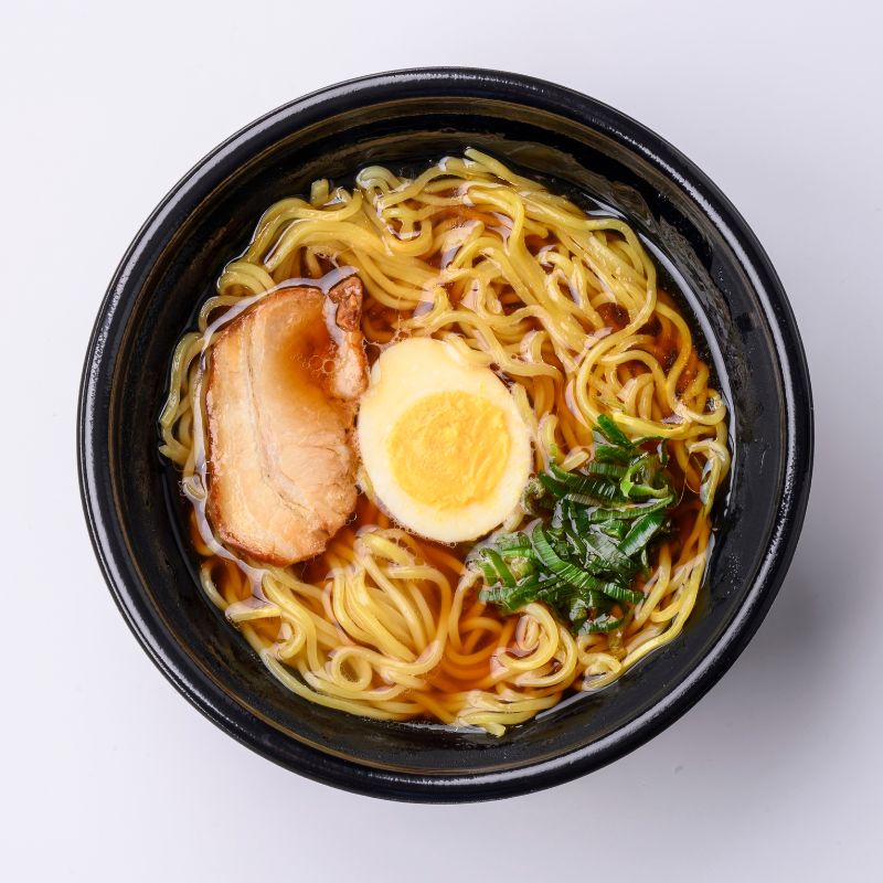 【内容】鶏ガラと鰹ベースを使用した醤油スープ。しなやかさとコシを兼ね備えた、コシのある食感を楽しめる三層麺を使用。チャーシュー、茹卵、青ねぎをトッピング