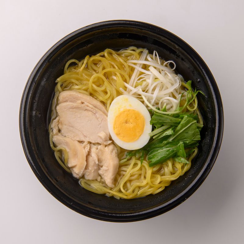 【内容】しなやかさとコシを兼ね備えたコシのある食感を味わえる三層麺を使用。鶏ガラと鰹ベースを使用した鶏塩スープ。サラダチキン、水菜、白髪ねぎ、茹卵をトッピング。別添ペッパー付き