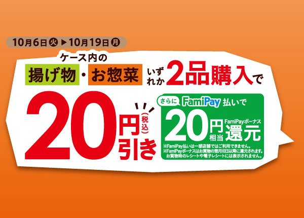 カウンターケース内の「揚げ物」・「お惣菜」2品で20円引き!※終了しました。 終了