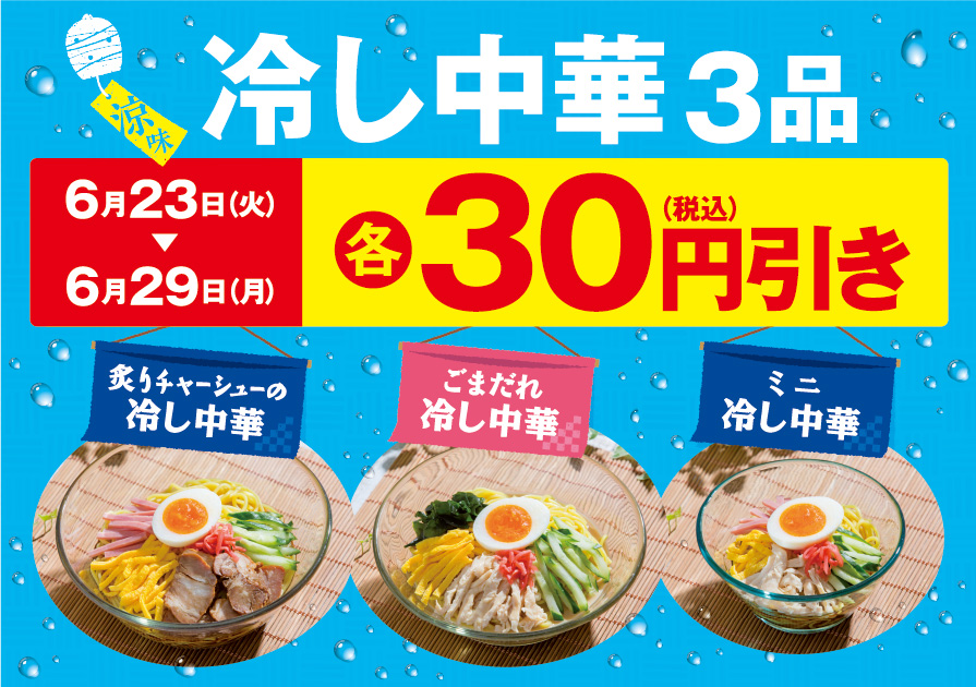 6月23日(火)~6月29日(月)までの1週間、リニューアルした冷し中華3品を30円引きセール実施します!