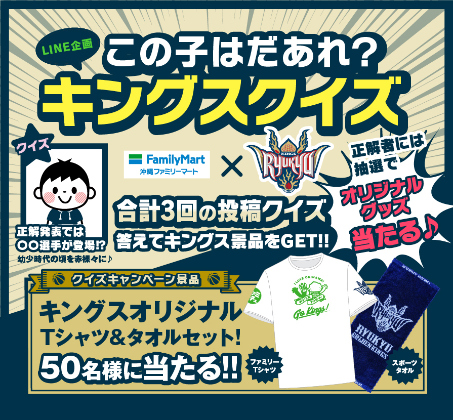 沖縄ファミリーマートLINEを友だち追加し、クイズに答えると、 ファミマ×キングス オリジナルグッズ など が当たるキャンペーンを実施中!