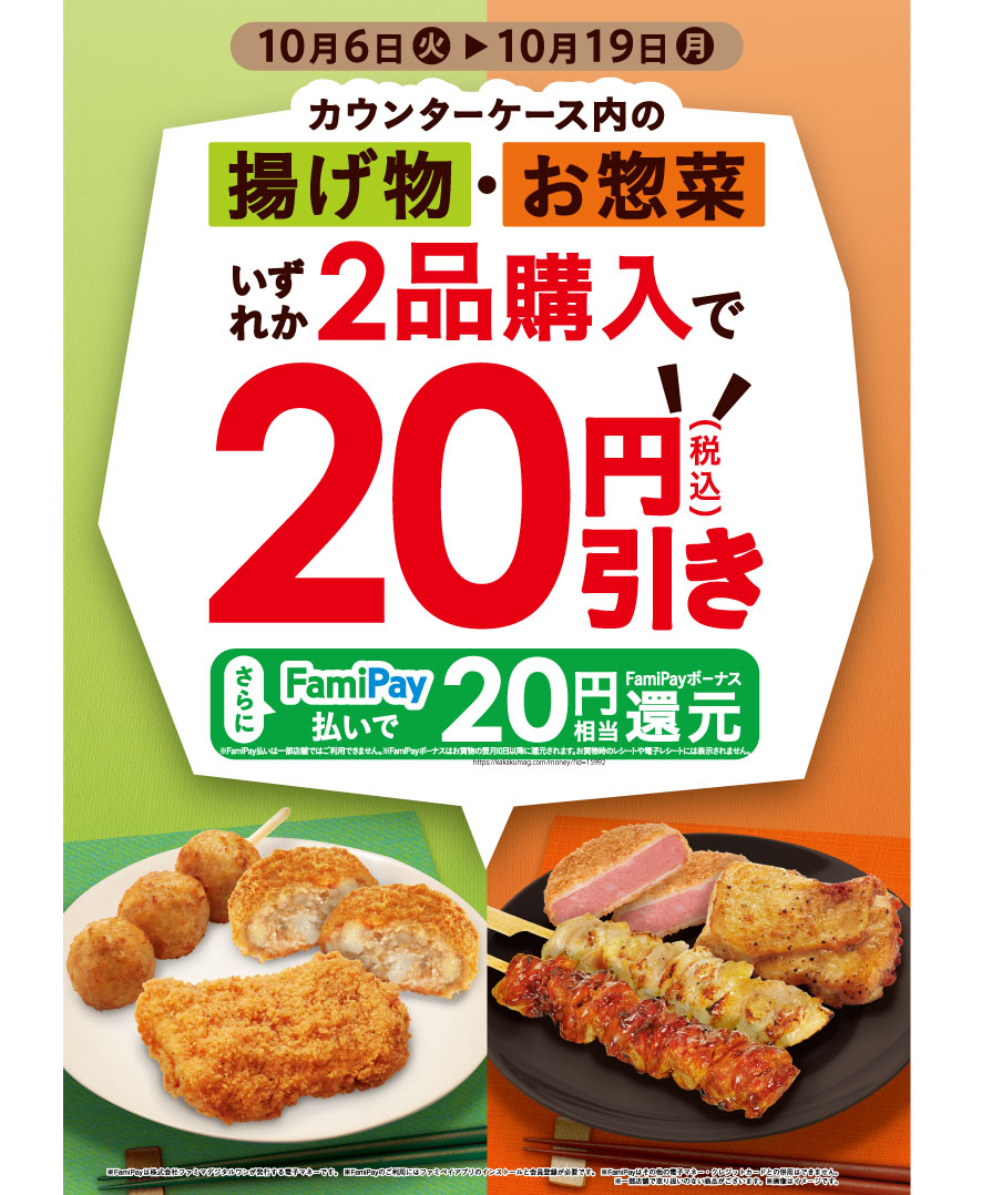 カウンターケース内の「揚げ物」・「お惣菜」2品で20円(税込)引き!さらに、FamiPay払いで20円相当FamiPayボーナス還元!