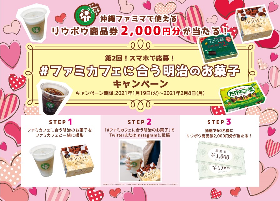 沖縄ファミリーマート公式アカウントTwitter、Instagramをフォローして、ファミカフェと明治のお菓子を一緒に撮影した写真を「#ファミカフェに合う明治のお菓子」で投稿すると抽選で60名様にリウボウ商品券2,000円分が当たる!