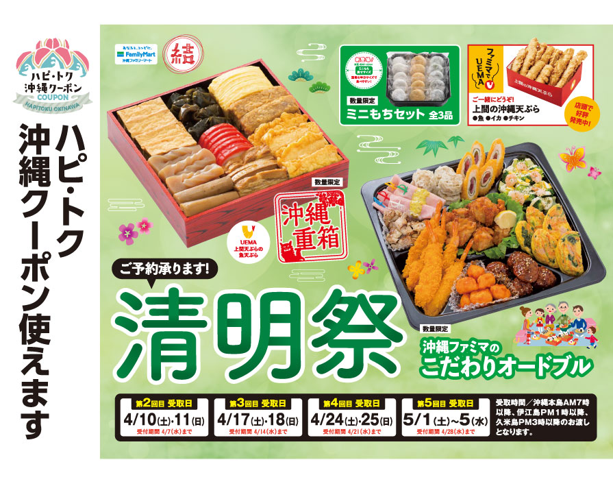 2021年の「清明祭」は沖縄ファミマの重箱、オードブルで♪沖縄重箱、オリジナルのオードブル、もちセット、焼菓子セットなど清明祭の需要に対応した商品のご予約承ります。(沖縄本島のみ)※受付期間は4月28日(水)まで