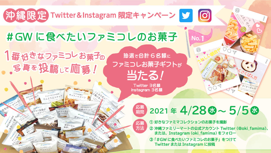 沖縄ファミリーマート公式アカウントTwitter、Instagramをフォローして、ファミコレお菓子の写真を投稿すると抽選でTwitter、Instagram合計6名様に「ファミコレお菓子ギフト詰め合わせ」が当たる!